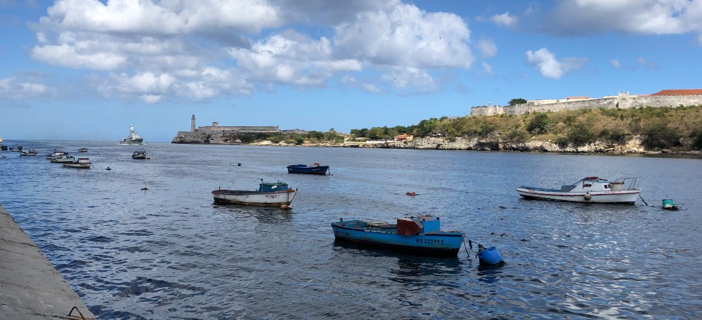 We quickly got settled and began our exploration around Old Havana. We made our way to the waterfront where it leads from Havana Port out to the ocean and walked along the deteriorating concrete walkway, taking in the sight of the parked classic American cars, cute fishing boats, and across the water, the Castillo de los Tres Reyes del Morro and adjacent fortress. A bit further along the malecon, we made our way past the very fancy-looking Hotel Paseo del Prado, which stands in stark contrast to deteriorating buildings almost next door – a contrast which would repeat itself throughout our exploration. From here, there’s a beautiful view along a long stretch of the Havana waterfront, with the Habana Riviera and Hotel Nacional de Cuba especially prominent.