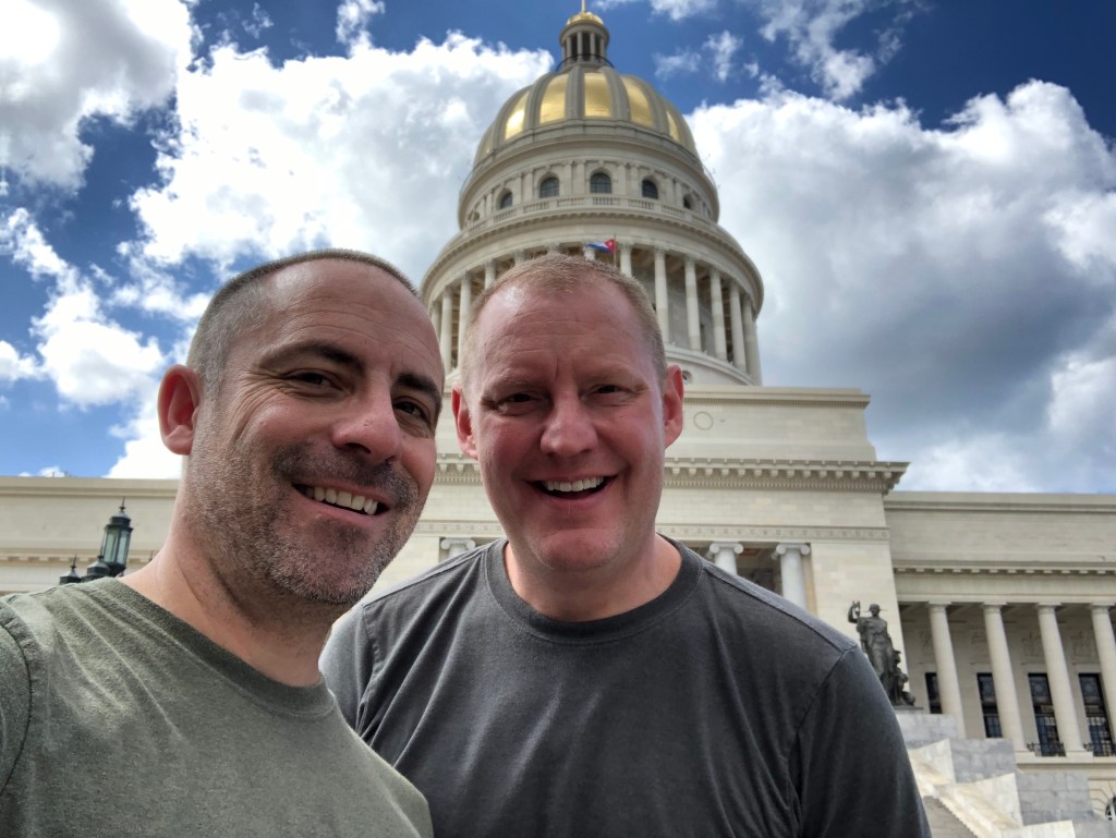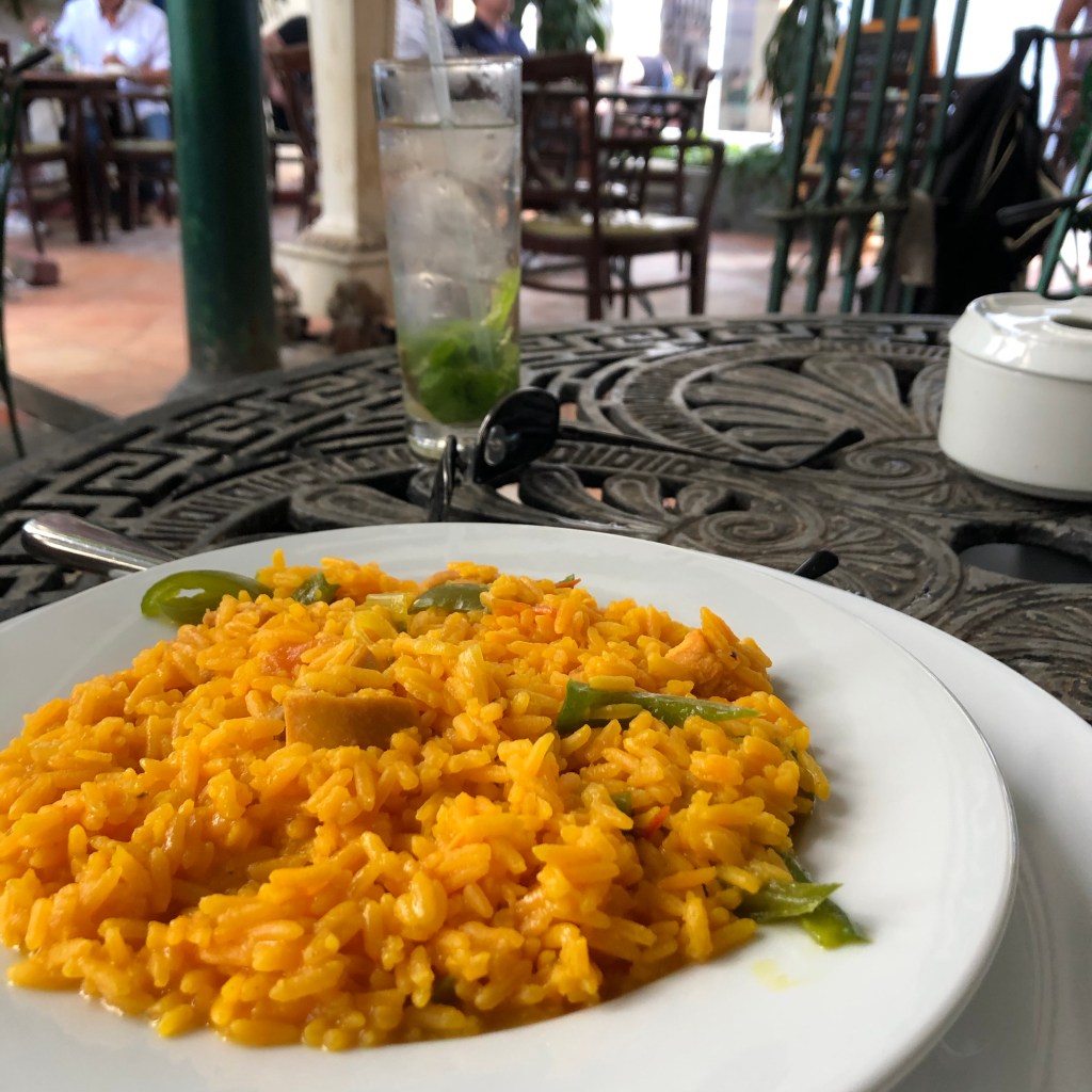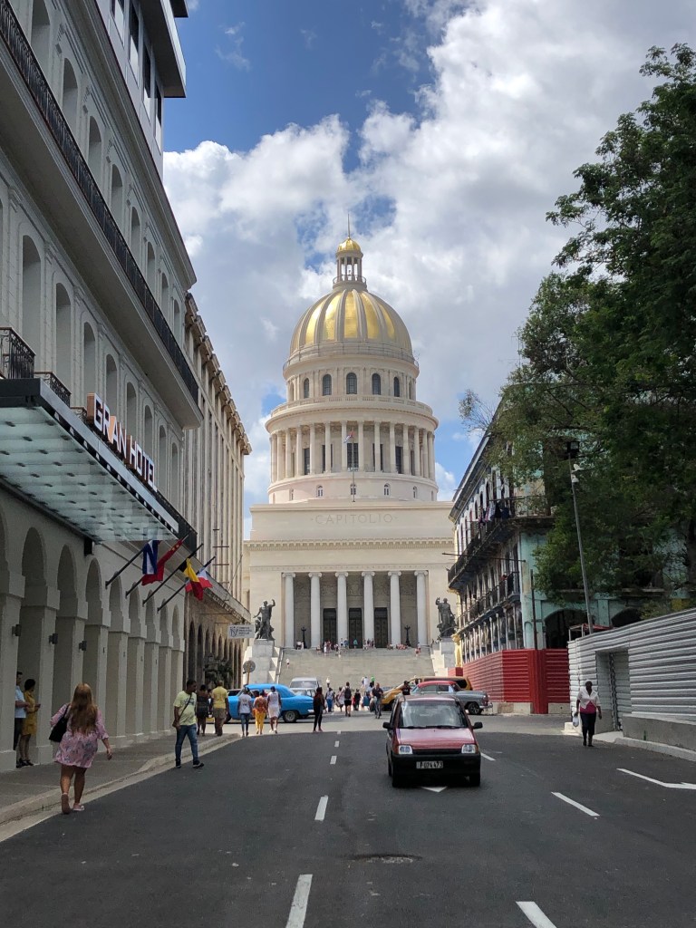 Following lunch, we took a few selfies on the steps of the nearby Capitolio, which was mostly finished after a many-year renovation for Havana’s 500th anniversary in 2019. We’re told the interior is still under renovation in 2020, in contrast to nearby hotels which, with private involvement, had similar interior and exterior restoration completed in just a year. In any case, the exterior of the capitol is glorious during the day, and even more so when lit up at night. Selfies snapped, we continued our exploration along Calle Obispo, another pedestrian street teeming with a local craft market, retail shops, a couple bars and restaurants, and more food windows. We popped into another restaurant/bar where a band was playing, and enjoyed their music while we had a mojito and some delicious Arroz Campesino (Very different than Arroz a la Cubana. Lesson learned.). After that: a nap.