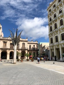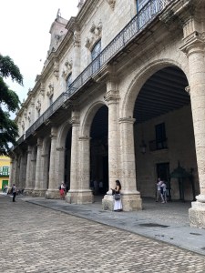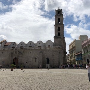 While our Thursday in Havana was hot and sunny, Friday brought all sorts of weather, starting out with drizzle and a short rain shower. Jose started us out walking toward Plaza Cathedral (Cathedral Square), ducking briefly into a storefront across from the main police headquarters to escape a rain shower. Jose has a great knowledge of the city and was easily able to talk about most anything we came across (police headquarters included). As soon as the shower subsided, we continued to Plaza Cathedral, where Jose gave us the low-down on how Cuba has become a melting pot of religions because of immigration over the years. In this case, it was Catholicism, since we were next to the Basilica and Convent of St. Francis of Assisi.