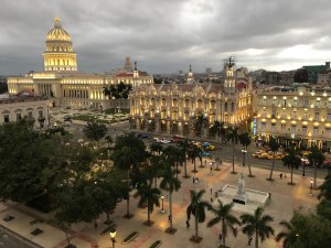 With tired feet after a full day of walking, we finished our tour with Jose and made our way to change some cash to get us through the evening, which we did in the lobby of the Gran Hotel Manzana Kempinski. Apparently they only change currency for patrons and guests, so we made our way to the rooftop bar for a beer and a visual treat as night began to fall. At dusk, the rooftop view is especially beautiful as the nearby Capitolo and Parque Central were light up for the evening.