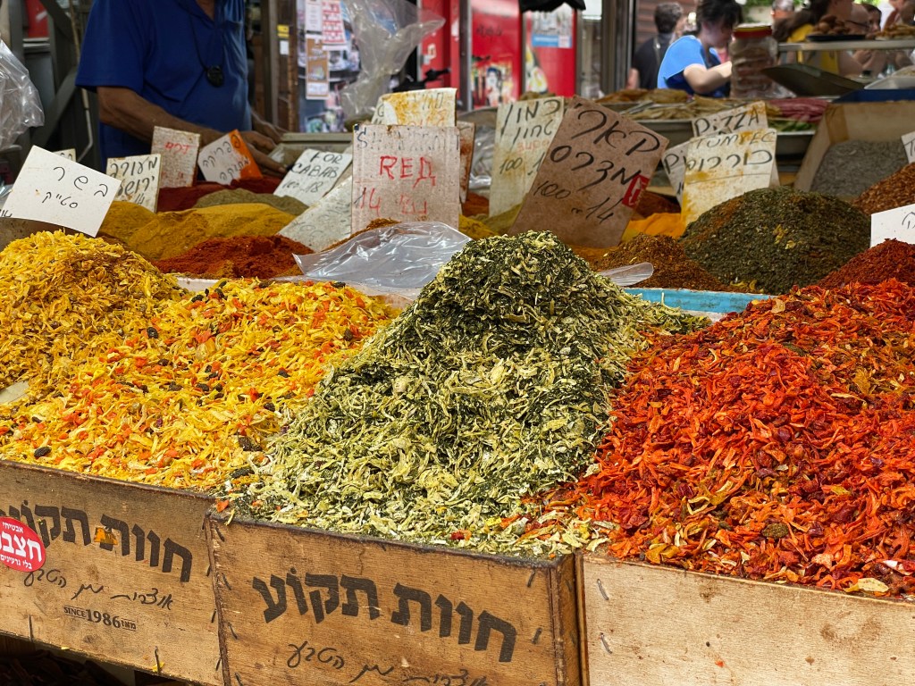 - Carmel Market (or Shuk HaCarmel) is a feast for the senses with the scents of spices, fruits and vegetables, and food vendors filling the air. Seriously, if you’ve ever ground your own spices, that’s what it smells like here. Amazing. Shops throughout the handful of blocks that make up the market are also packed with vendors selling clothes, shoes, pastries, and most anything else. The streets are packed with people, so go early or late if you’re not into crowds.