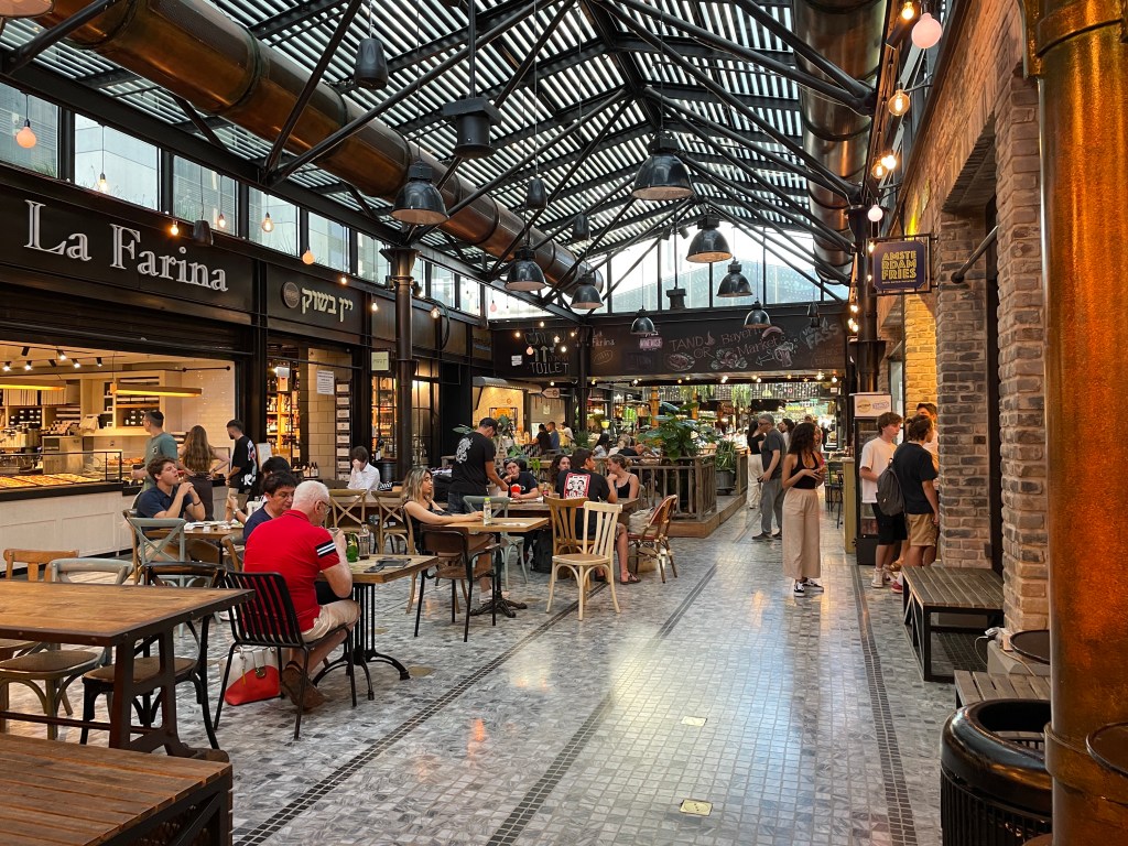 - Sarona Market may not technically strike most people as a market (it’s perhaps more of a food hall), but the 140-year old formar Templar colony is Israel’s largest indoor food market with international foods and drinks. Sarona is very similar to Oslo’s Mathallen Food Hall in Oslo, or a larger version of San Francisco’s Ferry Building. We spent the better part of a couple hours people watching at the Center Bar where the staff were especially friendly to us. If you go, don’t miss the pedestrian Giv’on Street a block away for more restaurants, Schnitt Brewing, and the beautiful plaza.