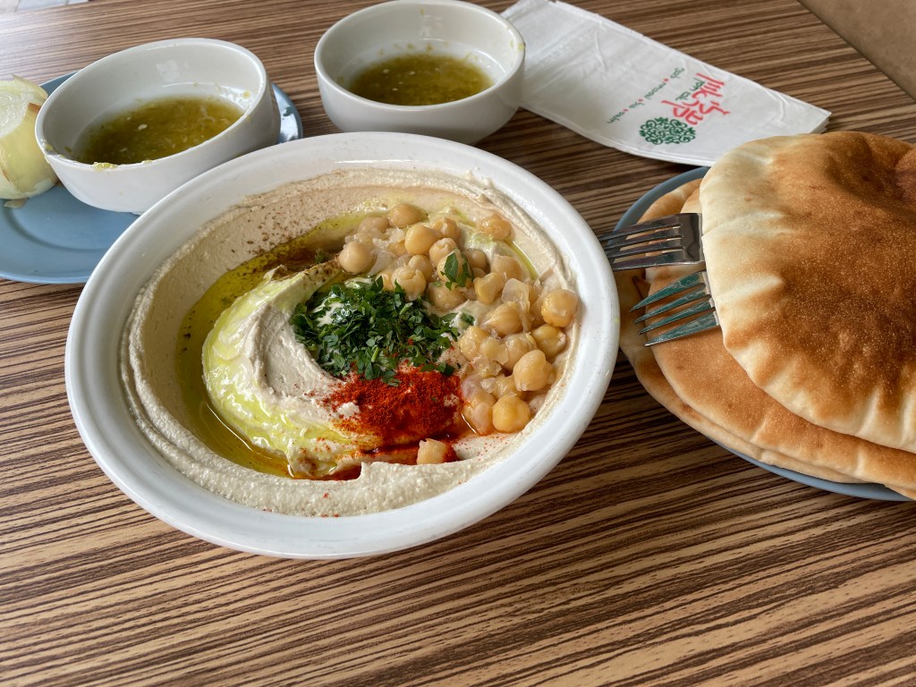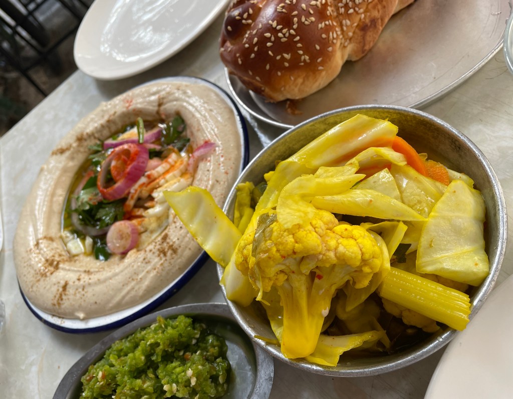 Hummus Abu Hassan has three locations and from every guide I read, is often considered the best place for hummus in Tel Aviv (so much so, it has its own Wikipedia page). And from what I gather, Tel Aviv is one of, if not the place for hummus. We went to the Jaffa location which is tucked into a residential neighborhood you likely wouldn’t happen upon unless this is your destination (which it should be). New folks show up nonstop to eat or get take out for one of the three options on their menu: regular, spicy, or fava bean. Whatever you order, it’s served with a whole warm chickpeas, a dish of minced peppers, a plate of pitas, and a quartered onion. Scoop the hummus with the pitas or onion, or just eat it with your fork, but you won’t be disappointed if you go here.