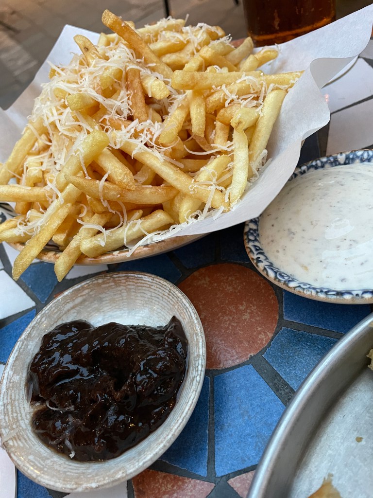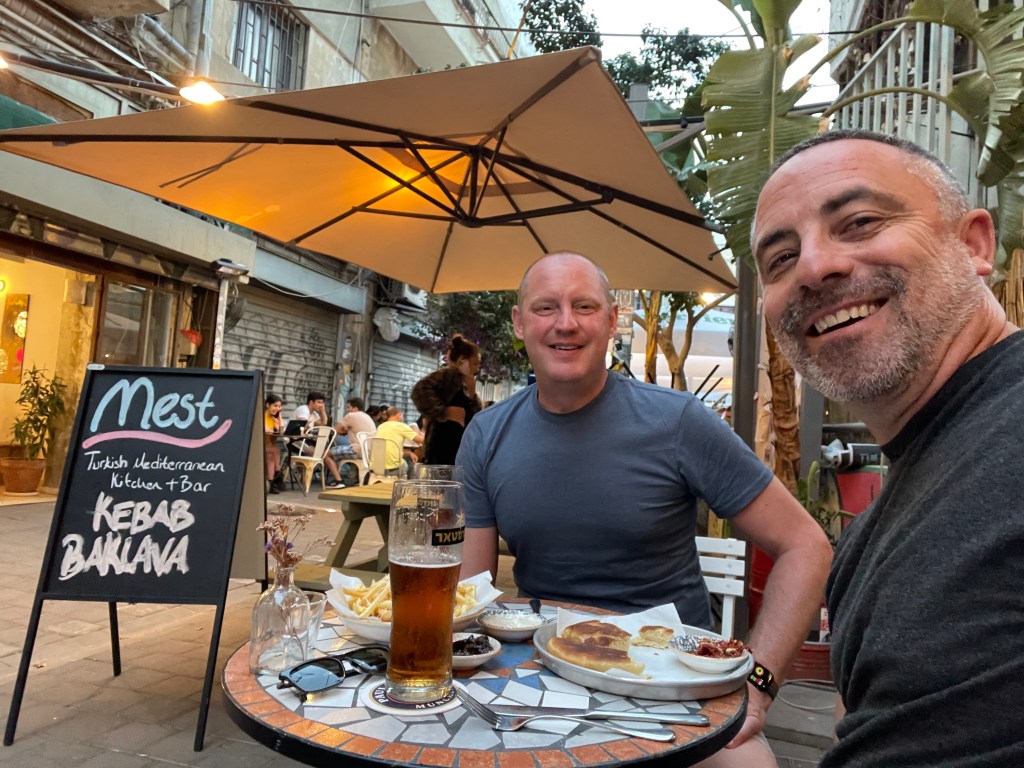 Speaking of markets, we didn’t check out much of Levinsky Market, but did partake in the food and drinks at a few of the restaurants and bars that surround it, particularly along the Simtat HaShuk pedestrian alley. We checked out a Turkish spot with great fries and black catsup (whatever makes it black was a closely-guarded secret—I asked). About a block away is Barehov. We just had beers there, but the food menu looked great and the staff was awesome. They even out some pickled veggies for us to snack on while we relaxed with our beers.
