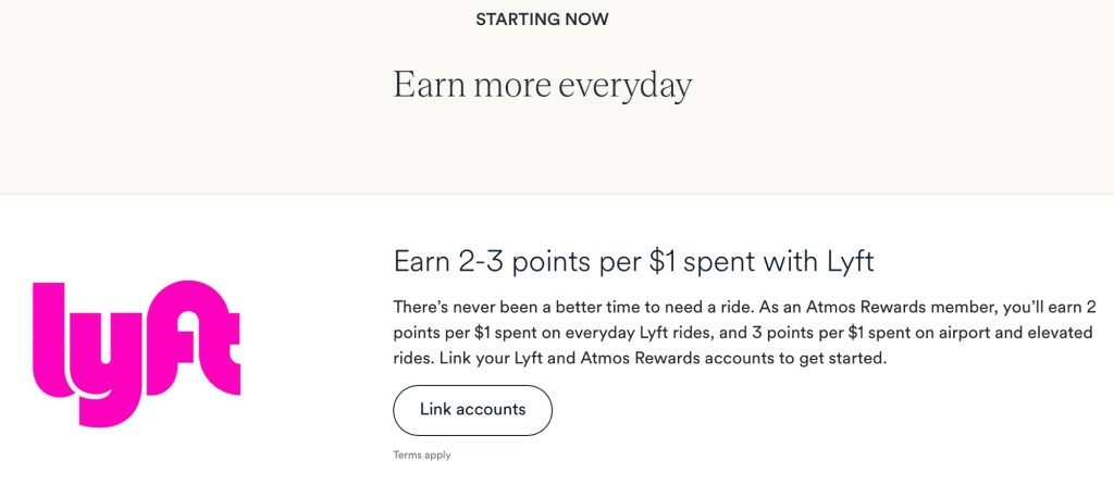 - NEW for August 2025: Link your Lyft and Atmos accounts and earn 2 points for each $1 spent on Lyft, or 3 points for each $1 spent on airport and elevated Lyft rides. For what it’s worth, I’ve found this hard to track and reconcile, so keep that in mind if you’re counting on these points.