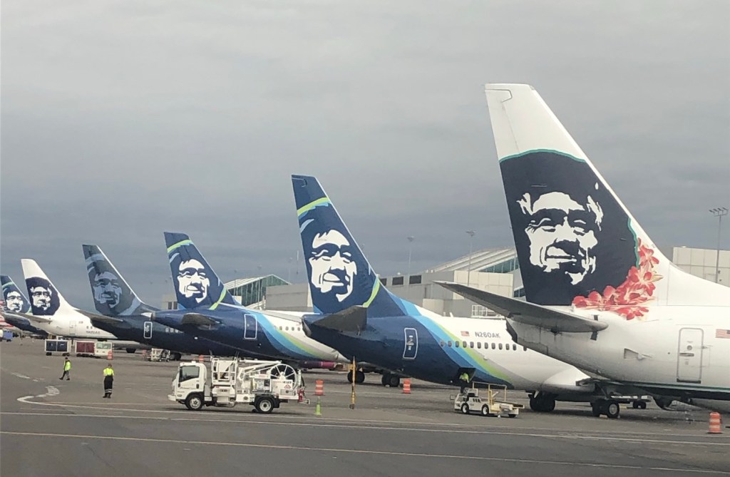 A throwback to retired (and current) Alaska liveries at PDX Airport.
