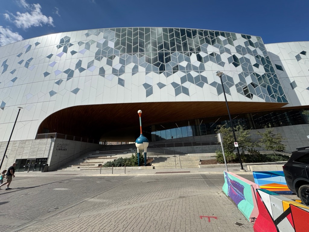 Fortunately, the journey’s half the fun. On the way, we checked out the Calgary’s New Central Library, with its fun public art and striking architecture (and rail tunnel which runs through the ground floor), then made our way past The Bow. The Bow’s height (it was Calgary’s tallest building until 2016) and curved facade makes it an easily-recognizable part of Calgary’s skyline, but the sculptures by Jaume Plensa at the entry plaza—particularly “Wonderland” at the south entry—are really the highlight. Folks who have been to Chicago will know the artist from his Crown Fountain reflecting pool and video sculpture in Millenium Park.