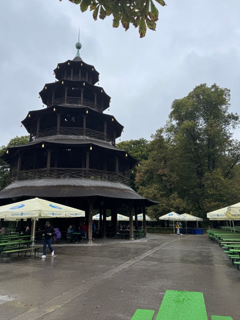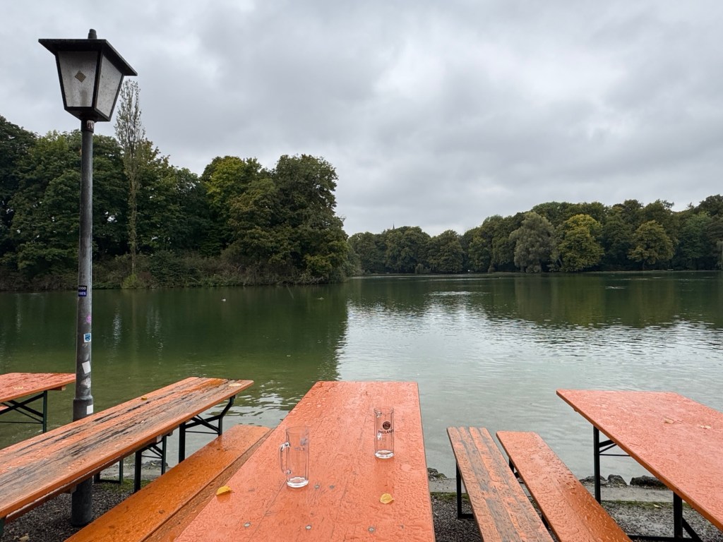 Still, we did pack a lot into our trip, including a bus ride through the MaxVorstadt neighborhood and past the Siegestor a giant arch dedicated to peace. We jumped off the bus at the English Garden. You might be able to fill much of a week just exploring this massive urban park. We were there on a drizzly Wednesday so we didn’t catch (or notice) the nudist meadow, but we did stop at Chinesischer Turm (the Chinese tower) for a bite and a beer in their beer garden. I’m told there’s often live music here, alas that was not the case at lunchtime on Wednesday. We also walked past the Seehaus Biergarten, which was also quiet on a damp midweek afternoon, but it was easy to see how beautiful it would be to catch the sun setting here with the lake in the foreground.