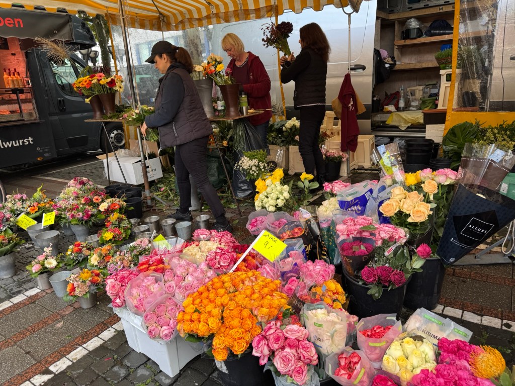 - Just a few blocks away is the Kleinmarkthalle, a food hall with take away windows, vendors of all sorts, and a public restroom, should you be in need. The weekend we were there last, the plaza behind the hall had a lively pop-up event with beer, wine, and cocktails where we met some new friends. Food halls are kind of my jam, so this is definitely recommended! 😉